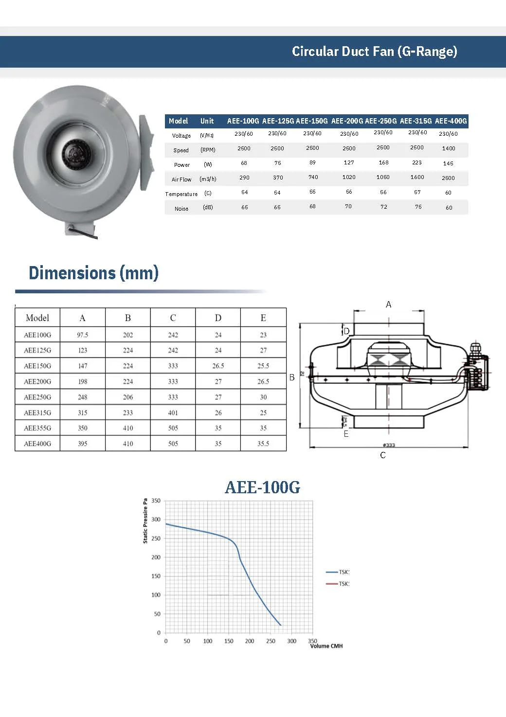 This Product has a Power Supply of Single Phase with a frequency of 50 Hz with a Power consumption of 68 watts and 2500 RPM. This blower is known as the AEE 100G Inline Fans with GI (Galvanized Iron) Body.