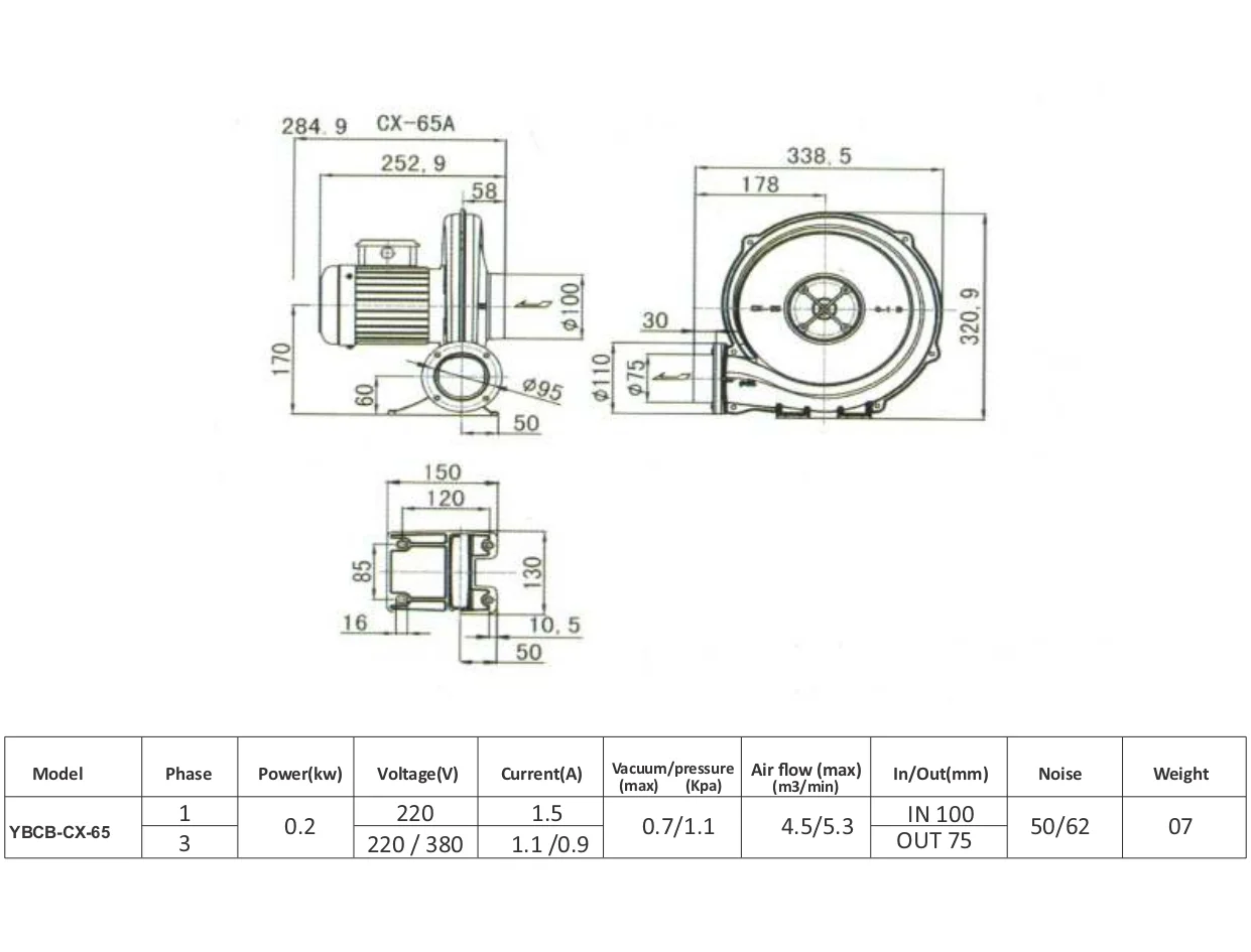 Point 2: Technical Details in other parameters are Displacement : 270-330 CMH; Vacuum : 700 PA; Pressure : 1100 PA; Inlet Size : 100 mm; Outlet Size : 75 mm; Power : 0.18 KW / 0.25 Hp